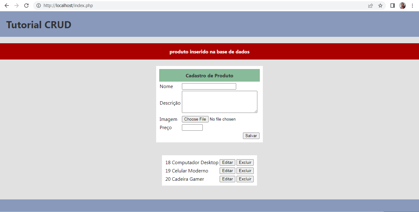Abaixo do formulário podemos exibir a lista de produtos cadastrados.